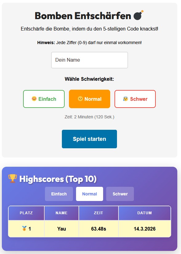 Hier wird es knifflig: Bei „Bombe entschärfen“ musst du einen fünfstelligen Code knacken, bevor die Zeit abläuft. Jede Zahl darf nur einmal vorkommen, was das Rätsel noch schwieriger macht. Je nach gewähltem Schwierigkeitsgrad wird das Spiel zu einer echten Herausforderung für dein logisches Denken.