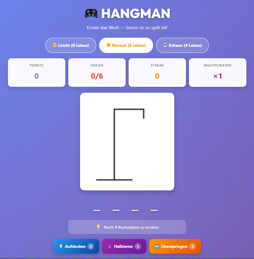 Hangman ist ein echter Spieleklassiker. Ziel ist es, ein verstecktes Wort zu erraten, indem du Buchstaben auswählst. Jeder falsche Buchstabe bringt dich näher an die Niederlage – deshalb ist gutes Kombinieren gefragt. Das Spiel macht besonders Spaß, wenn man versucht, mit möglichst wenigen Fehlern das Wort zu erraten.